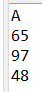// 아스키코드 대문자 A는 65부터, 소문자 a는 97부터, 숫자 0은 48부터 시작
