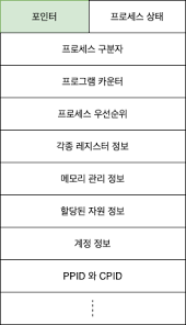 - 프로세스 제어 블록: 프로세스를 관리할 필요가 있는 정보를 포함하는 운영체제 커널의 자료구조