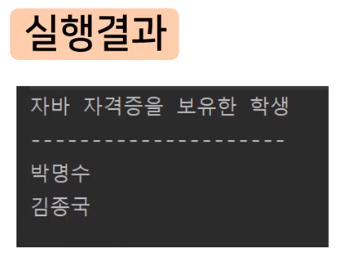 ArrayList를 이용하여 학생별 프로그래밍 언어 자격증 취득 정보를 관리하고, 자바 자격증을 보유한 학생 이름을 출력하시오.